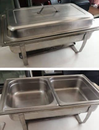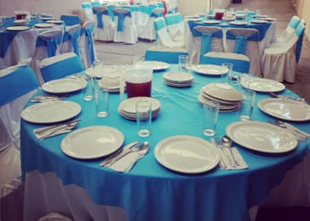 Vasos, copas para cóctel, platos arrocero y trinche, tazones, cafeteras, termos, cubiertos de primera calidad, chafers, así como bambalinas con cubremantel.